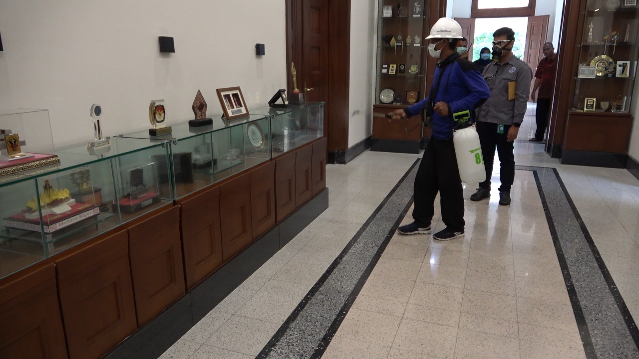 *Petugas dari Direktorat Sarana dan Prasarana ITB tengah menyemprotkan disinfektan di salah satu ruangan di Gedung Rektorat ITB, Jalan Tamansari No. 64 Bandung. (Foto: Humas ITB)